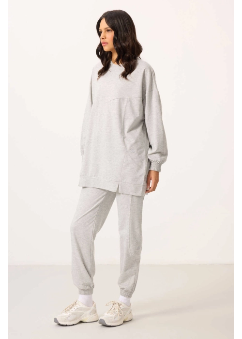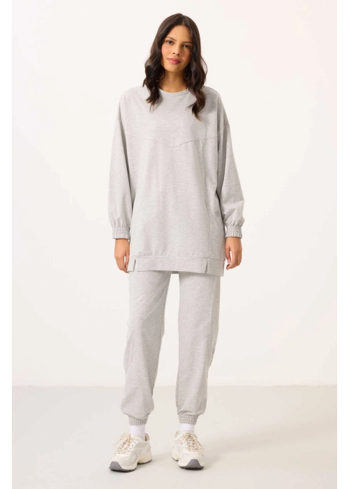 O Yaka Basic Oversize Kadın Gri Melanj Eşofman Tunik Takım